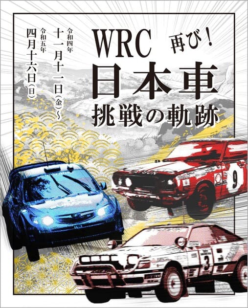 このラリージャパンを会期のスタートとして、当館では企画展「WRC 日本車挑戦の軌跡」を昨年に引き続き開催いたします。今回もWRC参戦経験のある日本車メーカー7社の協力で、当館初登場を含む貴重な歴史的車両がズラリと並びます。ラリー車とマンガ背景のコラボレーションという、よりパワーアップした2.5次元空間となるでしょう。ラリーの「いま」の熱気を感じながら、WRCの系譜をお楽しみください。