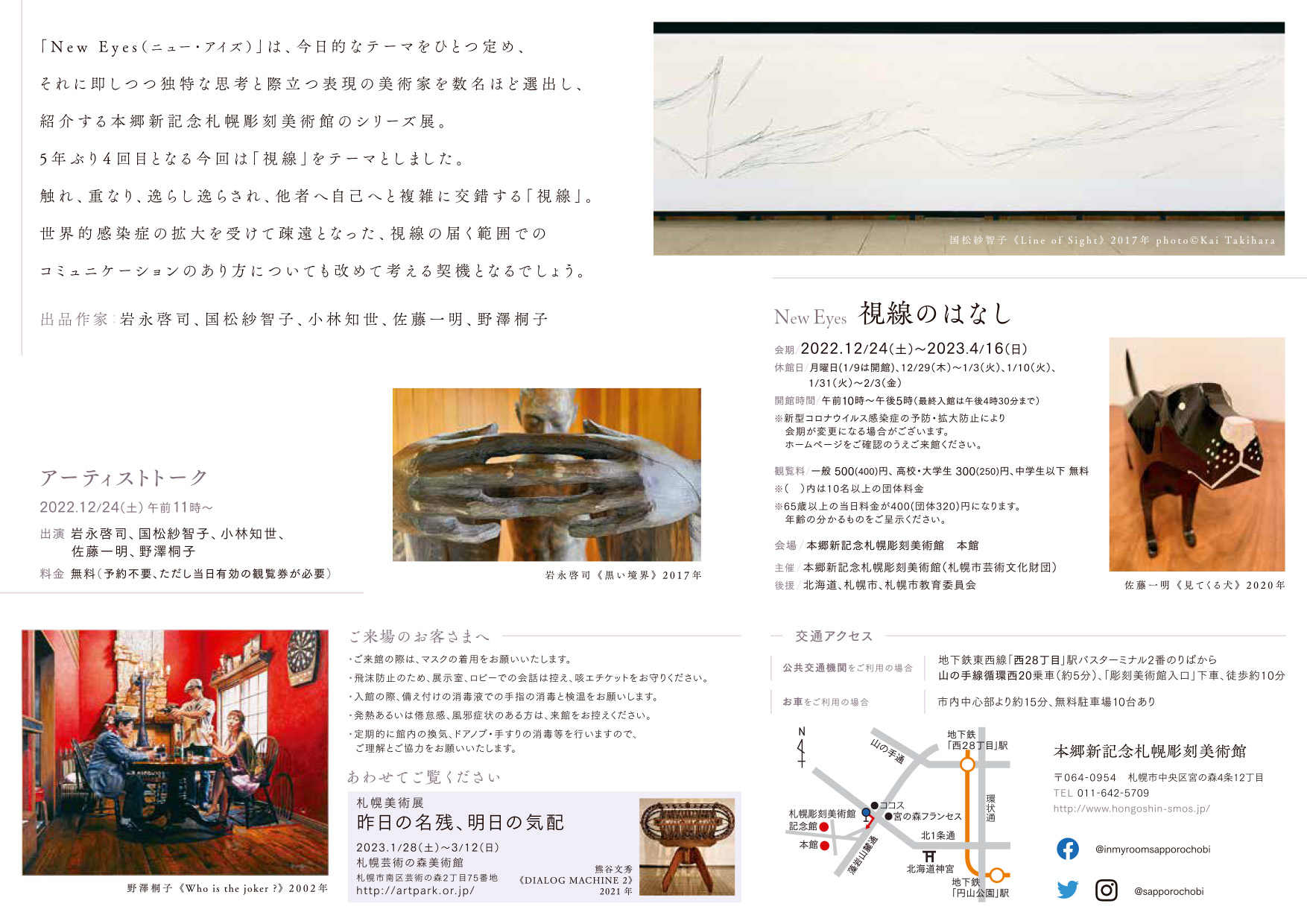 「New Eyes(ニュー・アイズ)」は本郷新記念札幌彫刻美術館のシリーズ展です。今日的なテーマをひとつ定め、それに即しつつ独特な思考と際立つ表現の美術家を数名ほど選出し、ここに紹介するものです。5年ぶり4回目となる今回は「視線」をテーマとしました。