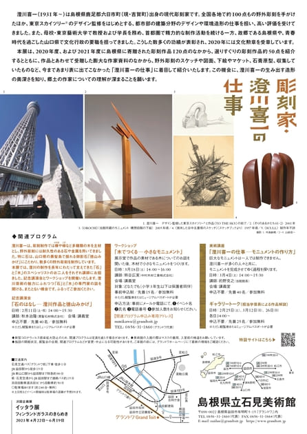 本展では、澄川の制作を長年にわたって支えてきた「石」と「木」のスペシャリストのお二人をそれぞれ講師にお招きした、記念講演会とワークショップを開催いたします。澄川芸術の魅力にふれつつ「石」と「木」の専門家の話を聞ける、またとない機会です。ふるってご参加ください。