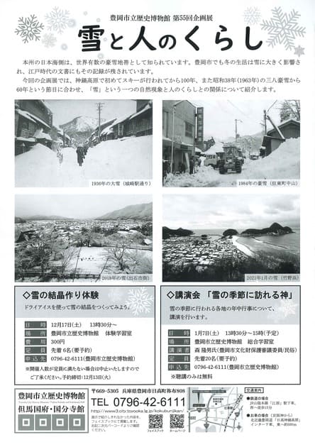 今回の企画展では、神鍋高原で初めてスキーが行われてから100年、また昭和38年(1963)の三八豪雪から60年という節目にあわせ、「雪」という一つの自然現象と人のくらしとの関係について紹介します。