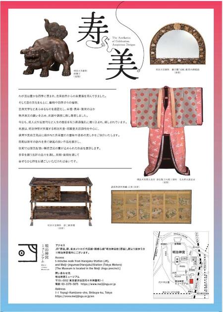 本展は、明治神宮が所蔵する明治天皇・昭憲皇太后御物を中心に、装束や美術工芸品に施された吉祥意匠の意味や造形の美しさをご紹介いたします。