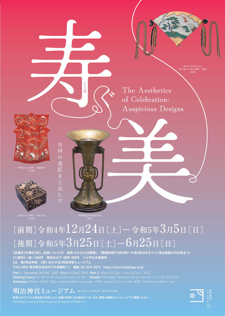 前期は新年の訪れを寿(ことほ)ぐ縁起の良い作品を展示し、後期では邪気を祓(はら)い無病息災などの意が込められた作品を展示します。多幸を願う吉祥の品々を通し、前期・後期を通して幸せなひと時をお過ごしいただければ幸いです。
