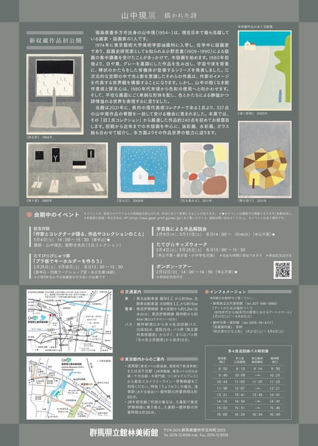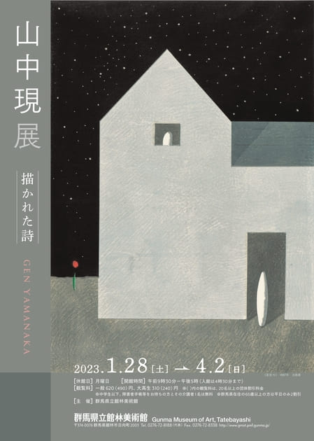 福島県喜多方市出身の山中現(1954- )は、現在日本で最も活躍している画家・版画家の1人です。 1974年に東京藝術大学美術学部油画科に入学し、在学中に版画家であり、版画史研究家としても知られる小野忠重(1909-1990)による版画の集中講義を受けたことがきっかけで、木版画を始めます。1980年前後より、白や黒、グレーを基調にした作品を生み出し、宇宙や夜を背景に、棒状のかたちをした有機体が登場するシリーズを発表しました。そして、三次元的な空間の中で光と影を意識したそれらの作風は、作家のイメージを代表する世界観を構築しました。しかし、山中の飽くなき創作意欲と探求心は、1980年代末頃から色彩の使用へと向かわせます。平坦な画面にごく単純な形体を配し、色とかたちによる静謐かつ詩情溢れる世界を表現するに至りました。 当館は2021年に、県内の現代美術コレクターであるI氏より、327点の山中現作品の寄贈を一括して受ける機会に恵まれました。本展では、その「旧I氏コレクション」から厳選した作品約240点を初めてお披露目します。初期から近年までの木版画を中心に、油彩画、水彩画、ガラス絵も合わせて紹介し、多方面よりその作品世界の魅力に迫ります。