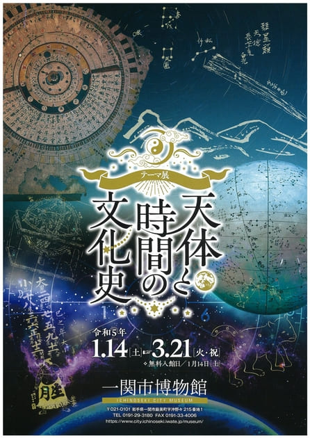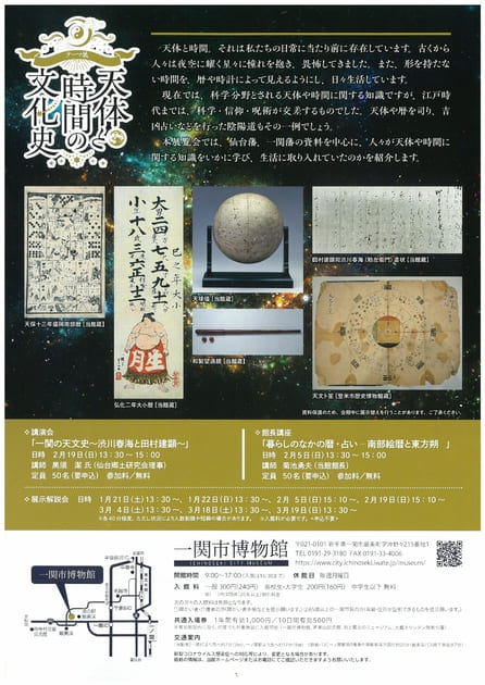 天体と時間。それは私たちの日常に当たり前に存在しています。古くから人々は夜空に輝く星々に憧れを抱き、畏怖してきました。また、形を持たない時間を、暦や時計によって見えるようにし、日々生活しています。現在では、科学分野とされる天体や時間に関する知識ですが、江戸時代までは、科学・信仰・呪術が交差するものでした。天体や暦を司り、吉凶占いなど行った陰陽道もその一例でしょう。本展覧会では、仙台藩、一関藩の資料を中心に、人々が天体や時間に関する知識をいかに学び、生活に取り入れていたのかを紹介します。