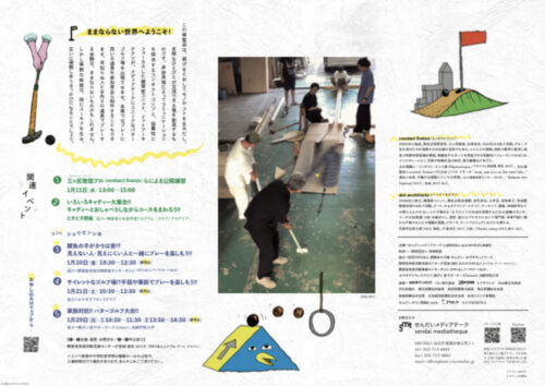 2組のアーティストが、見たことのないようなパターゴルフ場をつくります。プレーはもちろんのこと公園のような場所を、ただ眺めて楽しむだけでもOK。道具をつくるところからはじめることもできます。