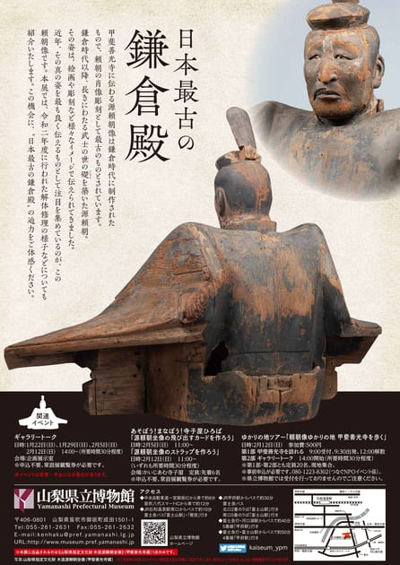 甲斐善光寺に伝わる源頼朝像は鎌倉時代に制作されたもので、頼朝の肖像彫刻として最古のものとされています。鎌倉時代以降、長きにわたる武士の世の礎を築いた源頼朝。その姿は、絵画や彫刻など様々なイメージで伝えられてきました。近年、その真の姿を最も良く伝えるものとして注目を集めているのが、この頼朝像です。本展では、令和2年度に行われた解体修理の様子などについても紹介いたします。この機会に、“日本最古の鎌倉殿”の迫力をご体感ください。