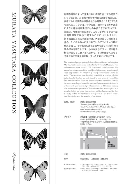 当館は、今後数年間に渡り、このコレクションの一部を期間限定で展示公開することにいたしました。第1回目にあたる本展示では、大型の美しい種を多く含み、たくさんの人に愛されているアゲハチョウ類に焦点を当て、その進化の過程を辿りながら16箱約450頭の標本を紹介します。小さな展示ですが、蝶の色や模様の美しさに魅了されながら、そのかけがえのなさや進化の不思議を感じ取っていただければ幸いです。