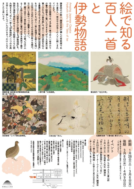 今回の企画展では、まず第一章で百人一首ゆかりの書や絵画をご覧いただきます。中でも定家の直筆とされる「小倉色紙」は、百人一首の原型を伝える貴重な作品です。また、菊池契月筆「六歌仙図屏風」をはじめとする、百人一首に登場する歌人を描いた近世から近代にかけての日本画の数々を展示。古に思いを馳せつつご鑑賞ください。第二章では百人一首の歌人の中から、17番「ちはやふる〜」を詠んだ在原業平に着目。恋多き美男子・業平を主人公とし、和歌を中心に展開する『伊勢物語』を、物語の場面を想起させるような絵画とともに読み解きます。