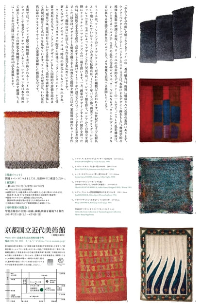 本展では、フィンランド国立博物館と並び称されるリュイユのコレクションとして著名なトゥオマス・ソパネン・コレクションを日本で初めて紹介します。リュイユの歴史を概観できる重要な作品を厳選し、主に1950年代以降に制作された作品約40点を展観します。