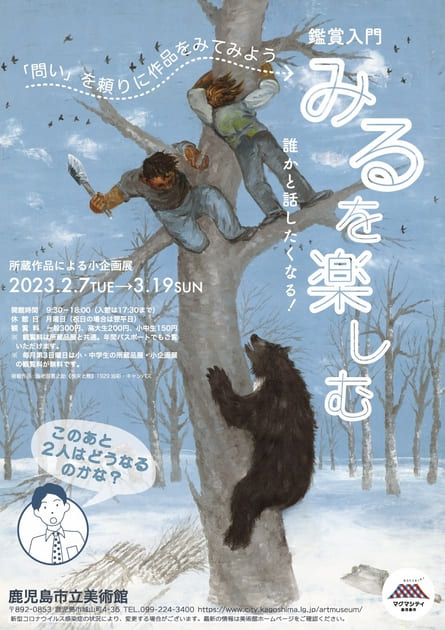 令和4年度最後の小企画展は、美術館での鑑賞の楽しみ方をご提案する、所蔵作品による「鑑賞入門 みるを楽しむ」を開催します。本展は、みなさんが作品とのかかわりをとおして、自分なりの作品の意味や価値をつくりだす、誰かと話したくなる展覧会です。美術館での鑑賞が初めての人からベテランの人まで、自分の経験や知識、感性などを働かせながら「みる」ことを楽しめるように、会場内に作品と向き合うきっかけの「問い」を設置しました。「この絵の中では、何が起こっていますか?」「この後、どうなってしまうでしょう?」などの「問い」を頼りに、自分の意見について、なぜそう思ったのか理由を考えながら、作品への思いを言葉にしてみませんか。自分自身や一緒に鑑賞する人との対話をとおして、自分なりの作品の意味や価値をつくりだす鑑賞を楽しみ、次の鑑賞体験につながる新たな視点がみなさんの中に増える機会になれば幸いです。