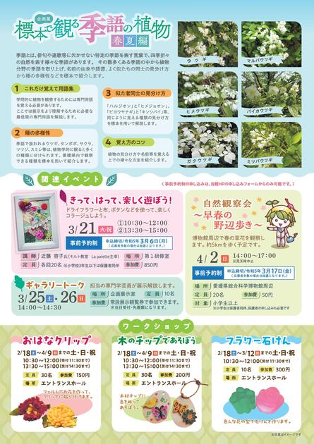 季語とは、俳句や連歌等に欠かせない特定の季節を表す言葉で、四季折々の この自然を表す様々な季語があります。 その数多くある季語の中から植物 分野の季語を取り上げ、名前の由来や語源、よく似たもの同士の見分け方 から種の多様性などを標本で紹介します。