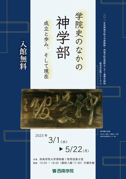 西南学院大学神学部の源流は、学院創立の1916(大正5)年よりも以前、1907(明治40)年の福岡バプテスト神学校の設立に求めることができます。 設立以来、神学部は大名、西新、干隈とキャンパス移転を繰り返し、2023(令和5)年現在は西新キャンパスで他の学部と共に教育・研究の日々を過ごしています。 100年以上にわたるこの長い歴史の中で、多くの問題に直面しながら、神学部は牧会や教育の現場でキリスト教について語る人々を育て世に送り出してきました。本展覧会では、その歴史の一端と現在の神学部教育について、さまざまな資料と共に紹介します。