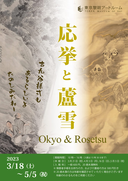 円山応挙の絵画作品(《花鳥図》《布袋図》《観瀑図》など)、そして長沢蘆雪の絵画作品(《雲龍図》《牧童図》など)を展示します。応挙は円山派の祖であり、写生を重視した明瞭な画風が人気の絵師。蘆雪は、応挙の門人として名高く、現在は奇想の画家として人気を博しています。