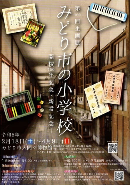 明治5(1872)年8月に学制が公布され、学区に基づいて全国に小学校が設置されることが定められました。みどり市東町の花輪小学校は市内で最も早く、明治6年5月に開校しており、昭和6(1931)年に建て替えられた校舎は国登録有形文化財に指定されています。今年で開校150周年を迎えますが、一方で、みどり市では令和4(2022)年に笠懸西小学校とあずま小中学校が開校するという新しい動きもありました。