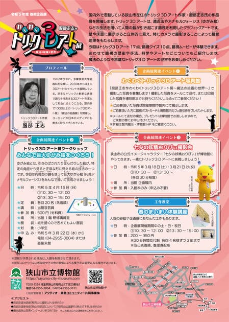 国内外で活動している狭山市在住のトリック3Dアート作家・服部正志氏の作品展を開催します。