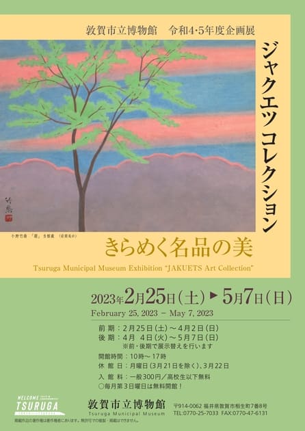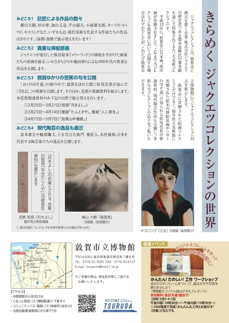 | 公式HP | https://tsuruga-municipal-museum.jp/events/event/%e3%82%b8%e3%83%a3%e3%82%af%e3%82%a8%e3%83%84%e3%82%b3%e3%83%ac%e3%82%af%e3%82%b7%e3%83%a7%e3%83%b3%e3%80%80%e3%81%8d%e3%82%89%e3%82%81%e3%81%8f%e5%90%8d%e5%93%81%e3%81%ae%e7%be%8e/ |