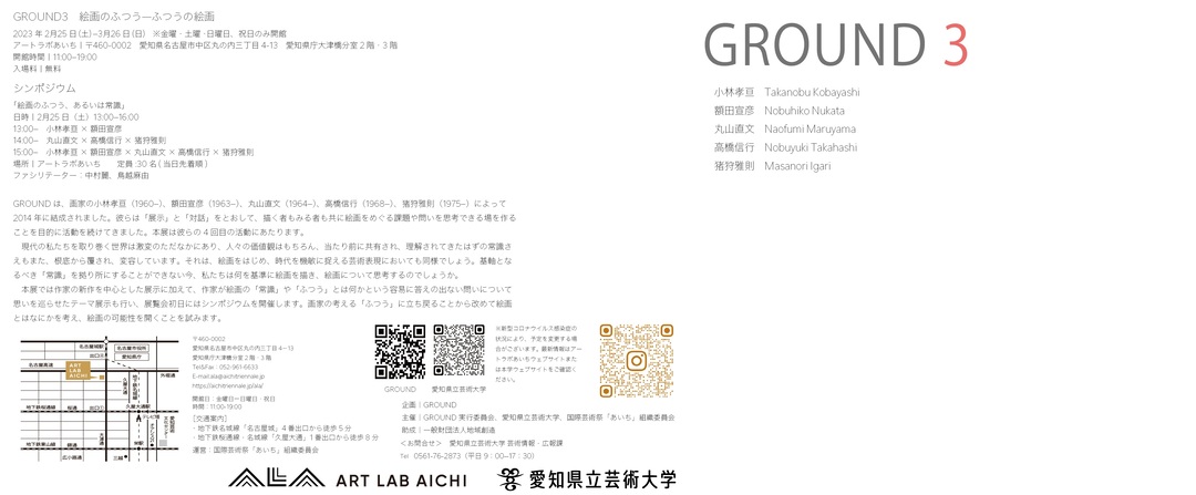 GROUNDは、画家の小林孝亘、額田宣彦、丸山直文、高橋信行、猪狩雅則によって2014年に結成されました。彼らは「展示」と「対話」をとおして、描く者もみる者も共に絵画をめぐる課題や問いを思考できる場を作ることを目的に活動を続けてきました。本展は彼らの4回目の活動にあたります。現代の私たちを取り巻く世界は激変のただなかにあり、人々の価値観はもちろん、当たり前に共有され、理解されてきたはずの常識さえもまた、根底から覆され、変容しています。それは、絵画をはじめ、時代を機敏に捉える芸術表現においても同様でしょう。基軸となるべき「常識」を拠り所にすることができない今、私たちは何を基準に絵画を描き、絵画について思考するのでしょうか。 本展では作家の新作を中心とした展示に加えて、作家が絵画の「常識」や「ふつう」とは何かという容易に答えの出ない問いについて思いを巡らせたテーマ展示も行い、展覧会初日にはシンポジウムを開催します。画家の考える「ふつう」に立ち戻ることから改めて絵画とはなにかを考え、絵画の可能性を開くことを試みます。