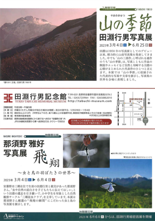 田淵館では3月4日のオープンから、1階では田淵の代表的な写真集「山の季節」に登場する写真を、地階では田淵の遺志を引き継ぎ、こども自然観察サークル「三郷昆虫クラブ」を主宰する那須野雅好さんの写真を展示します。