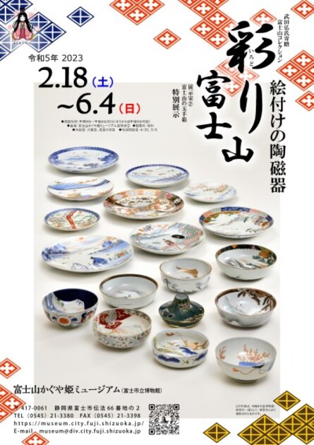 武田弘氏寄贈、富士山コレクシ ョンから、富士山が描かれた陶磁器を紹介します。また併せて、金地の小屏風とカラフルな扇子や扇を展示し、さまざまな陶磁器に華を添えます。