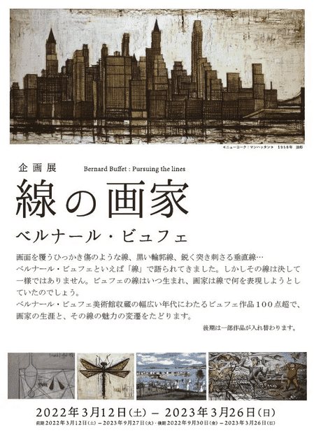 画面を覆うひっかき傷のような線、黒い輪郭線、鋭く突き刺さる垂直線…ベルナール・ビュフェといえば「線」で語られてきました。しかしその線は決して一様ではありません。ビュフェの「線」はいつ生まれ、画家は「線」で何を表現しようとしていたのでしょうか。
