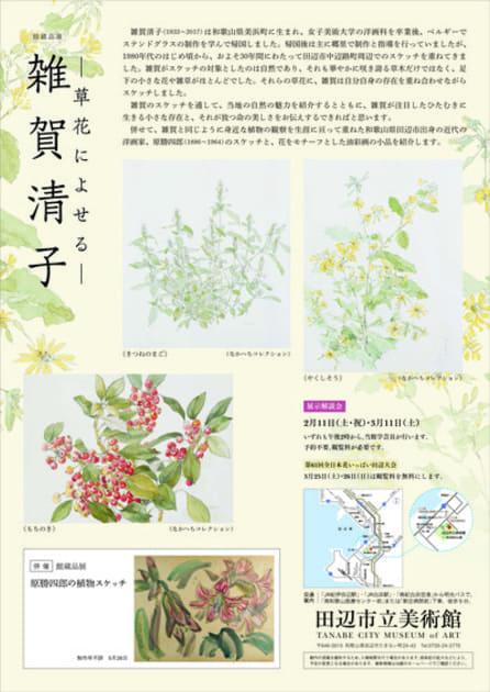 雑賀清子(1933~2017)は和歌山県美浜町に生まれ、女子美術大学の洋画科を卒業後、ベルギーでステンドグラスの制作を学んで帰国しました。帰国後は主に郷里で制作と指導を行っていましたが、1980年代のはじめ頃から、およそ30年間にわたって田辺市中辺路町周辺でのスケッチを重ねてきました。雑賀がスケッチの対象としたのは自然であり、それも華やかに咲き誇る草木だけではなく、足下の小さな花や雑草がほとんどでした。それらの草花に、雑賀は自分自身の存在を重ね合わせながらスケッチしました。