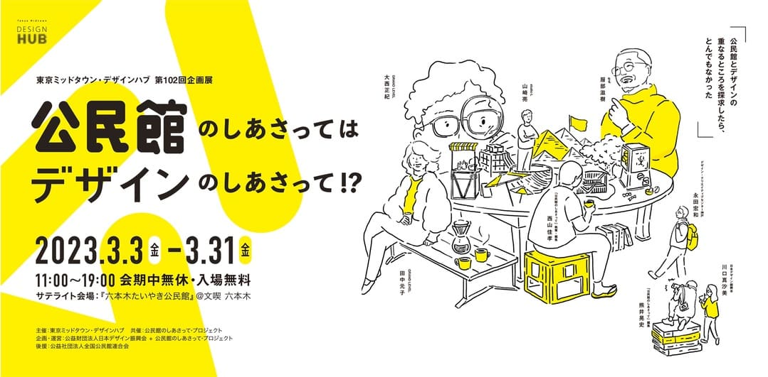 東京ミッドタウン・デザインハブでは、第102回企画展として、2023年3月3日(金) – 31日(金)、「デザイン」と「公民館」双方の視点から地域のデザインを掘り下げる「公民館のしあさってはデザインのしあさって!?」展を開催します。