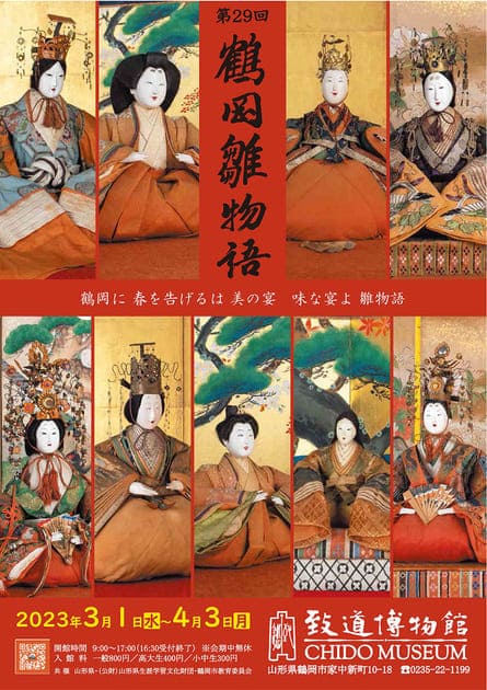 市内各所で開催され、鶴岡に春を告げる恒例の行事「鶴岡雛物語」展。当館では、旧庄内藩主酒井家や旧家伝来の雛人形と雛道具、鶴岡伝統のお雛菓子を一堂に展示。大名家ならではの、典雅な雛祭り。