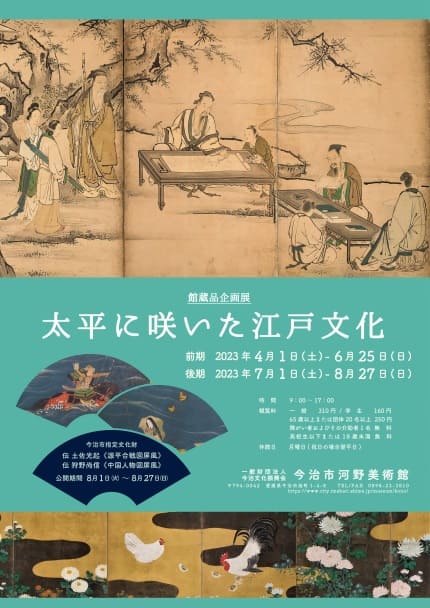 寛永文化、元禄文化、宝暦~天明文化、化政文化と時代ごとに4つに区切り、それぞれの文化の特徴をよくあらわす資料を展示します。前期展と後期展の間で一部展示替えを行い、また後期展の会期内で今治市指定文化財特別公開期間を設け《源平合戦図屛風》《中国人物図屏風》を展示します。