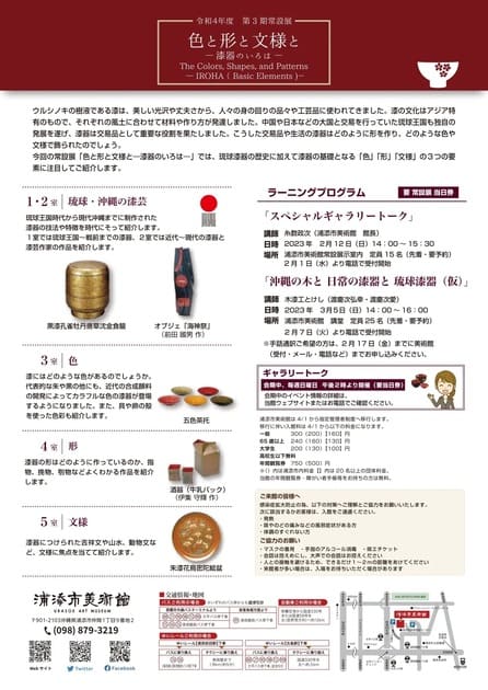 今回の常設展「色と形と文様と―漆器のいろは―」では、琉球漆器の歴史に加えて漆器の基礎となる「色」「形」「文様」の3つの要素に注目してご紹介します。