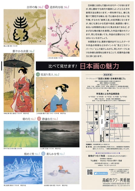 日本画には好んで描かれるモチーフがありますが、同じ題材でも時代や画家によってとらえ方や表現方法は異なります。一例を挙げると、春に先駆けて開花する梅は、松・竹と組み合わせると「松竹梅」すなわち「歳寒三友」の吉祥画になりますが、他にも清らかな花姿や色彩、格調高い香り、あるいは特徴的な枝ぶりに焦点をあてるなど、さまざまな梅の魅力を表現した作品が描かれています。同じ花を描いても、作品の主題はひとつではないといえるでしょう。