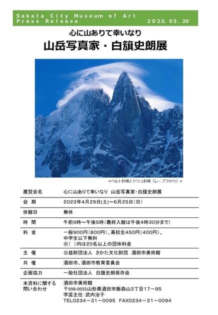 | 公式HP | https://www.sakata-art-museum.jp/events/event/%e5%bf%83%e3%81%ab%e5%b1%b1%e3%81%82%e3%82%8a%e3%81%a6%e5%b9%b8%e3%81%84%e3%81%aa%e3%82%8a-%e5%b1%b1%e5%b2%b3%e5%86%99%e7%9c%9f%e5%ae%b6-%e7%99%bd%e7%b1%8f%e5%8f%b2%e6%9c%97%e5%b1%95 |