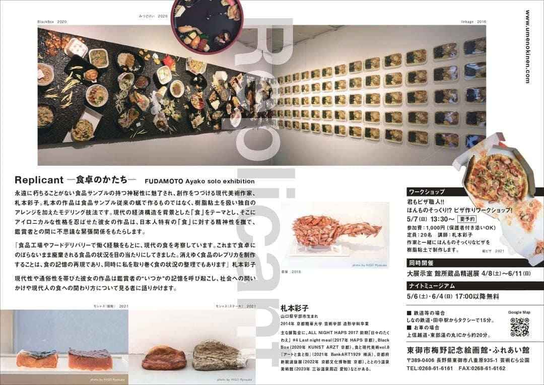 『食品工場やフードデリバリーで働く経験をもとに、現代の食を考察しています。これまで食卓にのぼらないまま廃棄される食品の状況を目の当たりにしてきました。消えゆく食品のレプリカを制作することは、食の記憶の再現であり、同時に私を取り巻く食の状況の整理でもあります』 札本彩子現代性や通俗性を帯びた彼女の作品は鑑賞者の“いつか”の記憶を呼び起こし、社会への問いかけや現代人の食への関わり方について見る者に語りかけます。