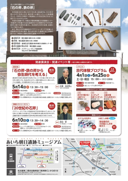 また、南山大学の調査団がパプアニューギニアで収集した民族資料の石斧の展示、復元品を用いた鹿角の加工実験の紹介など、学術的に貴重な資料も御覧いただけます。